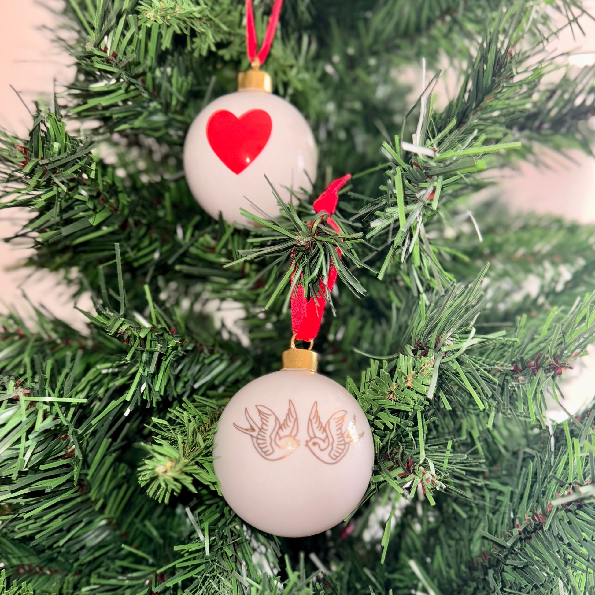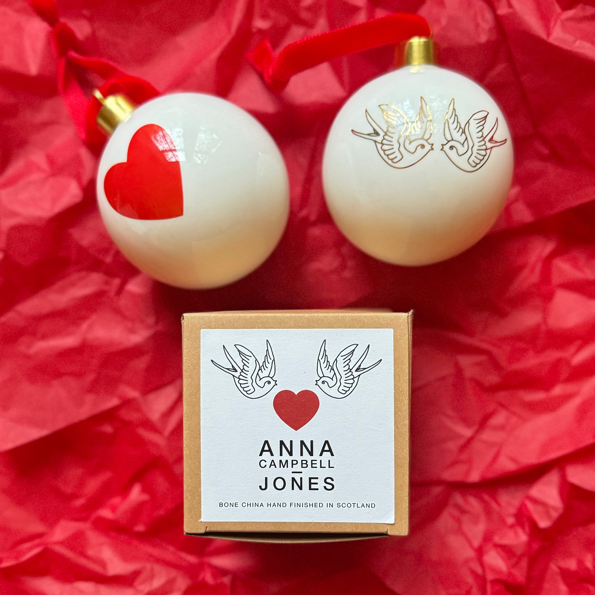 Made in Scotland with a pair of kissing swallows in real gold and a red love-heart printed on high quality bone china and hanging from a lush red velvet ribbon
