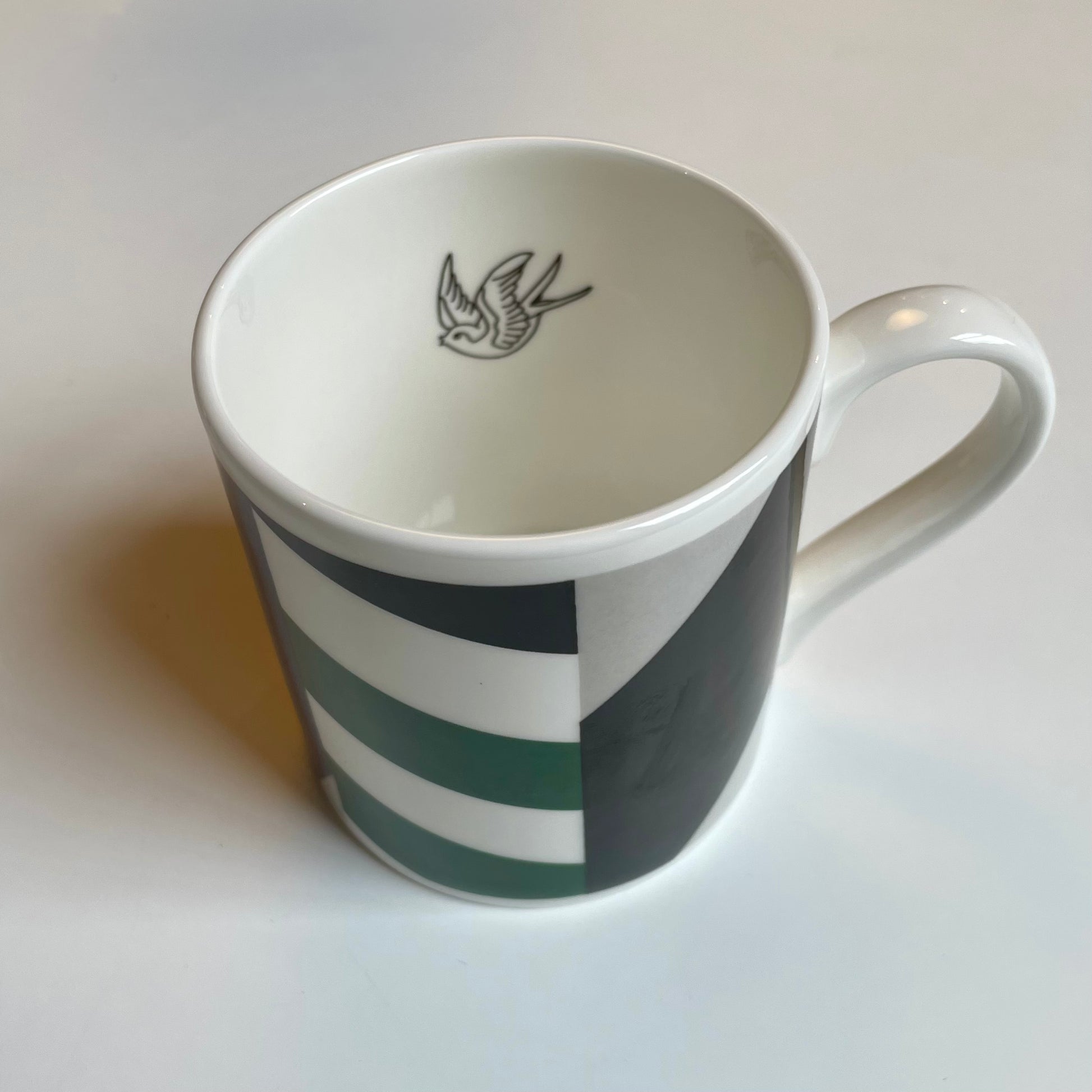Inside the mug is a swallow in flight, this references Edwardian Spode mugs that sometimes had a swallow inside with the words ‘However you try to drink me up, there’s always a swallow left in the cup’