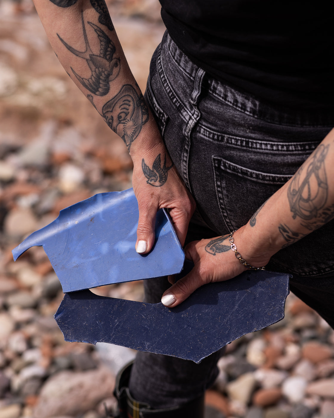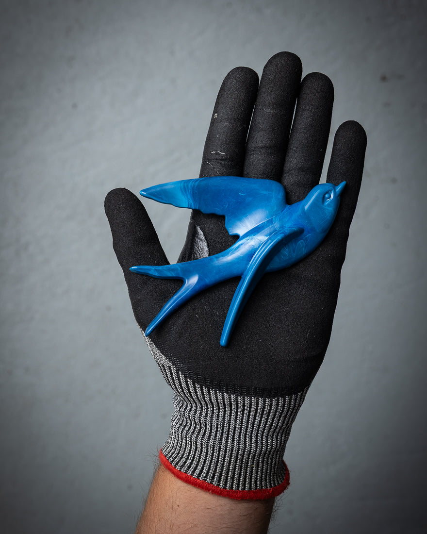 We use broken fish boxes sourced from different beaches and collected during our beach cleans. The old boxes are collected, washed, then shredded before being moulded into swallows in Scotland. You can see that the colour of the swallow comes from the colour of the box collected to make it