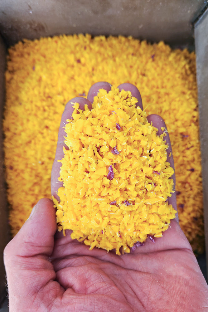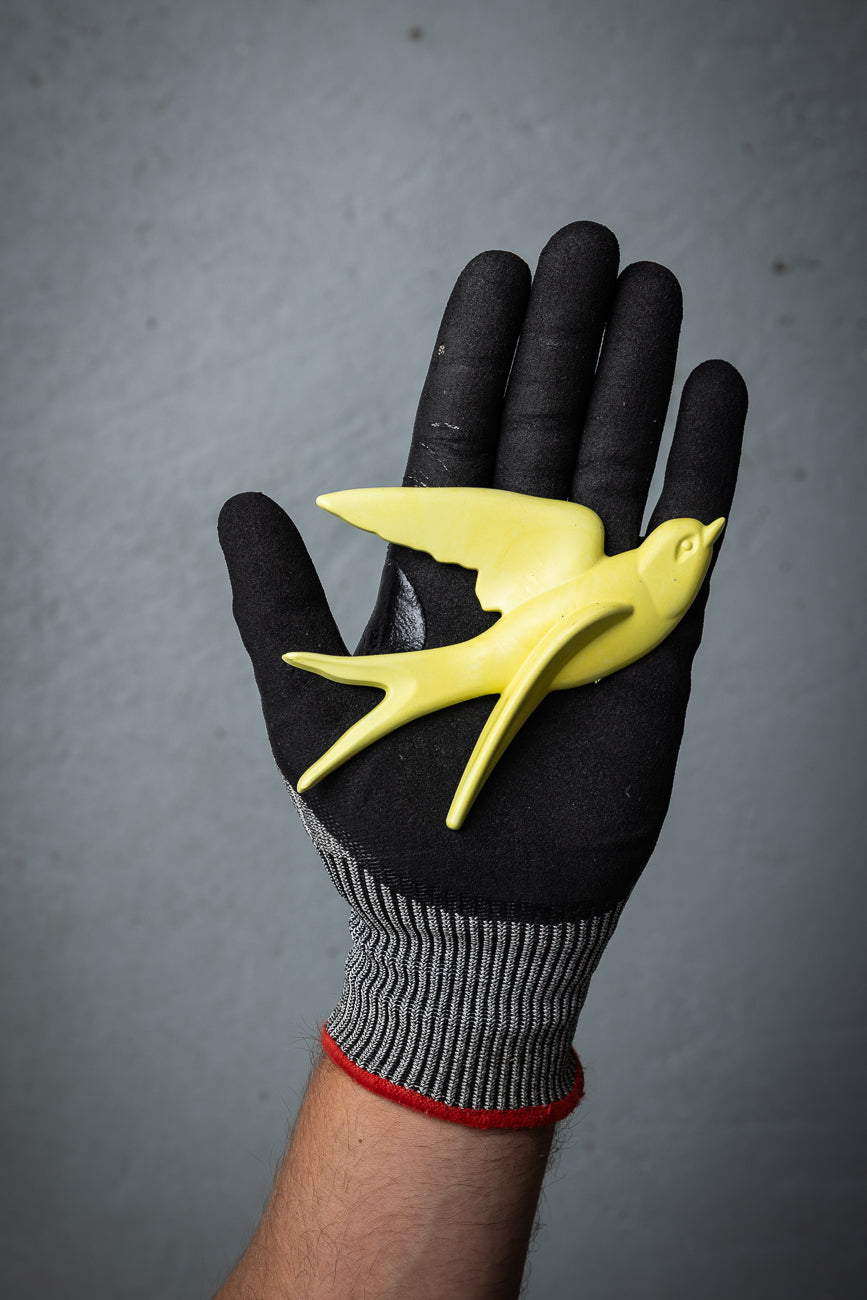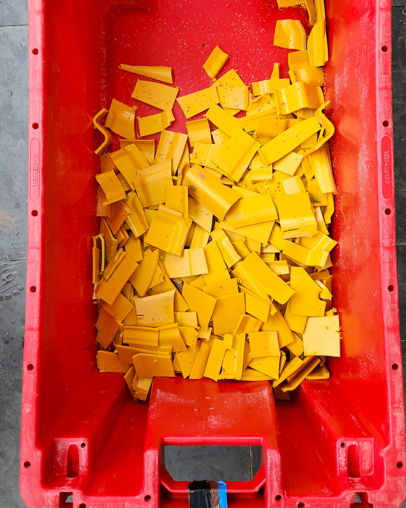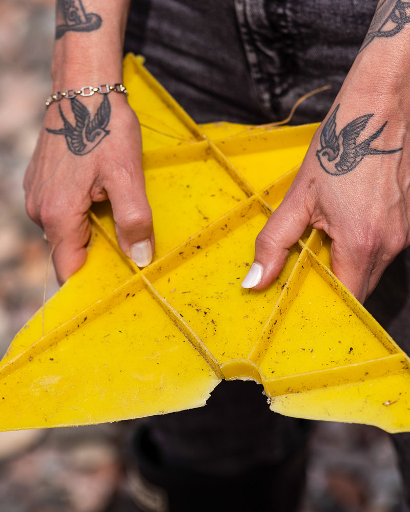 We use broken fish boxes sourced from different beaches and collected during our beach cleans. The old boxes are collected, washed, then shredded before being moulded into swallows in Scotland. You can see that the colour of the swallow comes from the colour of the box collected to make it